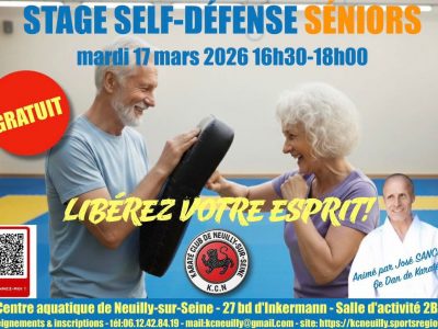 Le mardi 17 mars 2026, José SANCHEZ (6ème dan) organise un stage self-défense séniors à Neuilly-Sur-Seine de 16h30 à 18h00.