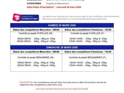 Chers Présidents de club, chers membres de l’Assemblée générale de la Ligue Régionale Provence Alpes côte d'Azur de Karaté et Disciplines Associées, Nous avons l’honneur de vous annoncer que l'assemblée générale de la LR PACA se tiendra : SAMEDI 10 janvier 2026 au COMPLEXE SPORTIF DE PEYPIN Rue Puits Armand – 13124 PEYPIN Les présidents de clubs recevront une [...]