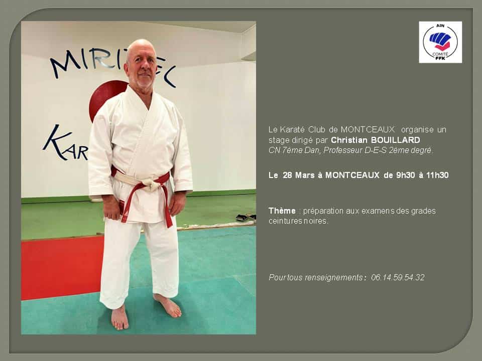 Le Karaté Club de MONTCEAUX organise le 28 mars 2026 un Stage Dirigé par Christian BOUILLARD 7 éme DAN