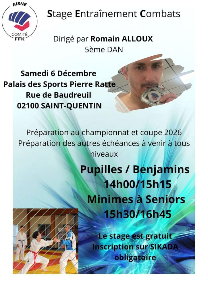 Samedi 6 décembre Romain ALLOUX dirigera le stage d'entraînement combats. Le stage est ouvert à tous et gratuit Inscription obligatoire sur SIKADA jusqu'au 4 décembre