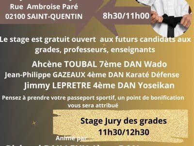 Dimanche 9 novembre au gymnase Collery à Saint-Quentin, venez peaufiner votre préparation aux grades. Vous avez encore quelques questions, n'hésitez pas, les intervenants seront là pour vous répondre. Le stage jury des grades, il faut être au minimum 2ème DAN, la liste sera établie pour la saison en cours.