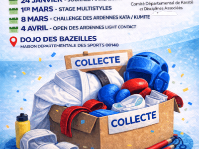 Le Comité Départemental de Karaté des Ardennes organise une collecte solidaire de vêtements et de petit matériel sportif, dans une démarche à la fois écologique et solidaire. L’objectif :✔️ Réduire le gaspillage✔️ Favoriser l’accès au sport pour tous✔️ Soutenir des pratiquants et associations dans le besoin 📅 Dates des collectes – Dojo de Bazeilles 24 [...]