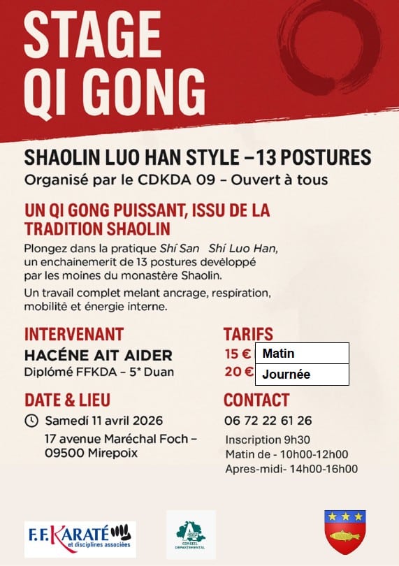 Le Comité Départemental organise un stage Expert Tai Chi Chuan avec Hacène AÏT AIDER 5ème Duan ancien champion du monde, le samedi 11 avril 2026 au Dojo de MIREPOIX.