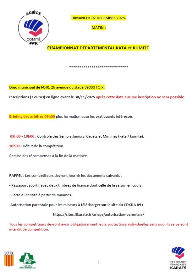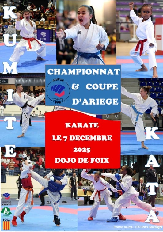 Le Comité Départemental d’Ariège organise son Championnat Départemental de Karaté Kumité le dimanche 7 décembre 2025, de 9h à 12h, au Dojo de l’École des Arts Martiaux de Foix.