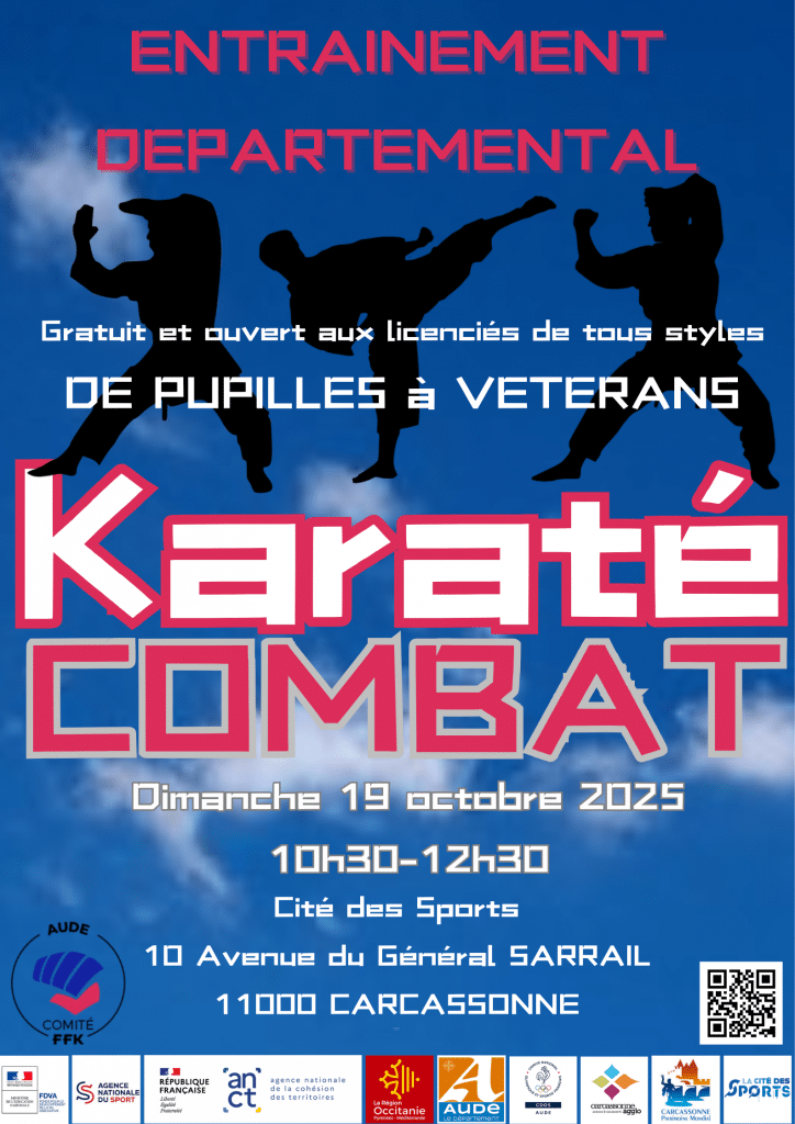 ENTRAINEMENT DEPARTEMENTAL COMBAT 10H30/12H30 Ouvert à tous licenciés de la FFKDA de pupilles à vétérans Date Dim. 19 Octobre 2025 Lieu CARCASSONNE10 AVENUE DU GENERAL SARRAIL 11000 CARCASSONNE