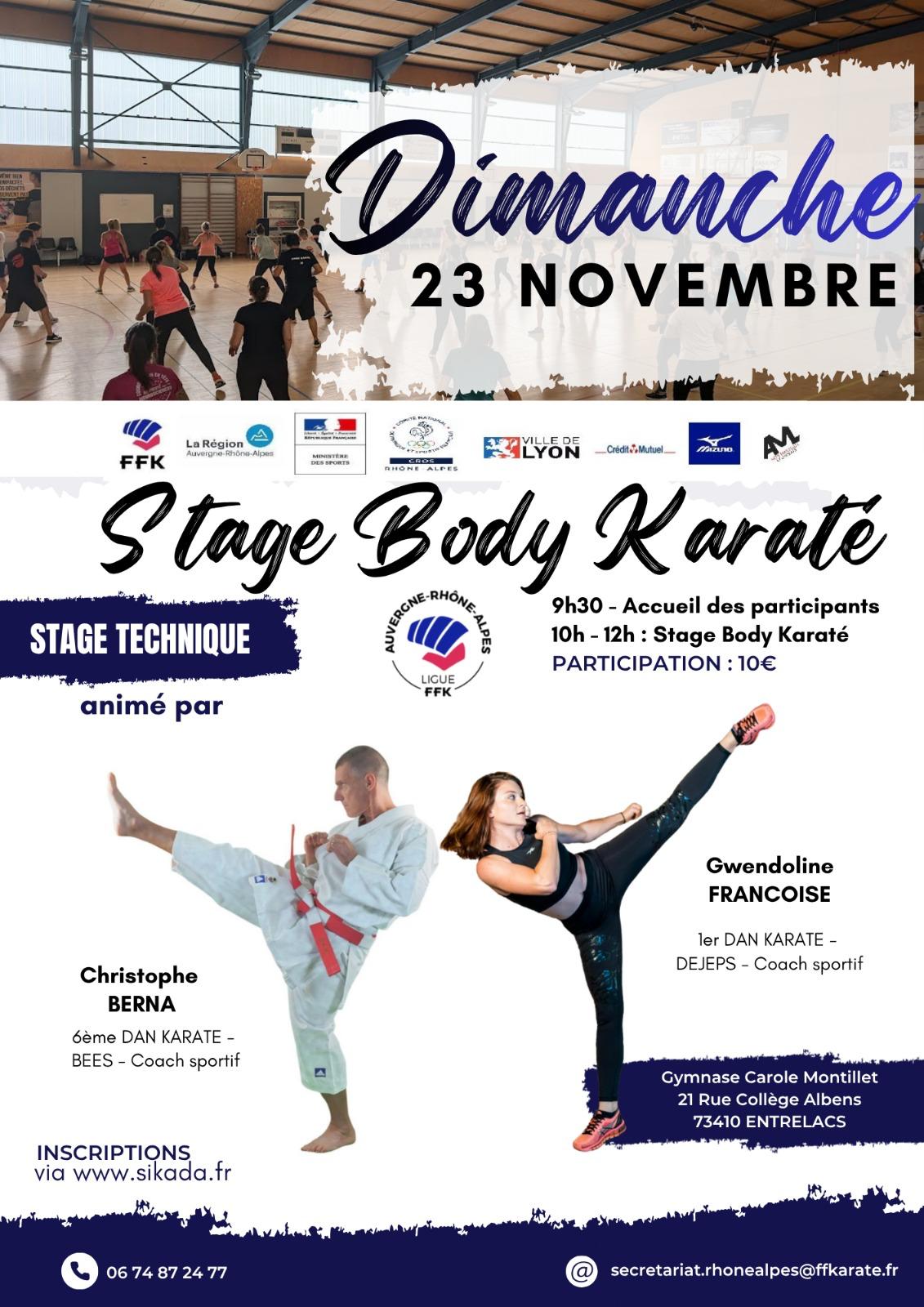 STAGE TECHNIQUE BODY KARATÉ dirigé par Gwendoline FRANÇOISE et Christophe BERNA Date Dim. 23 Novembre 2025 Lieu Gymnase Carole Montillet21 RUE DU COLLEGE ALBENS 73410 ENTRELACS