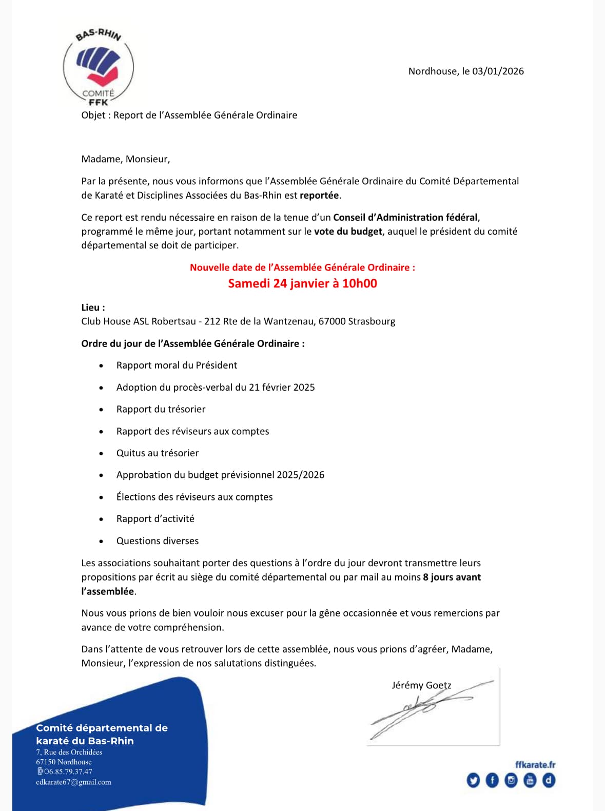 Assemblée Générale CDK67 : modification !!! (Le samedi 24/01/2026) à Strasbourg (Robertsau) Date Sam. 24 Janvier 2026 de 10h à 12h30 Lieu Dojo de Plobsheim La Forge 2 rue du Moulin 67115 Plobsheim