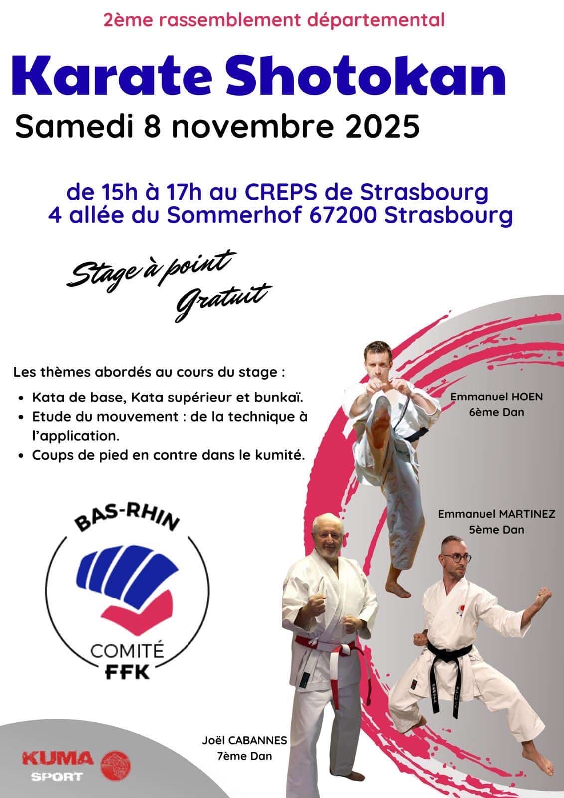 Stage CDK67 – Rassemblement Shotokan Date Sam. 8 Novembre 2025 de 15h à 17h Lieu CREPS STRASBOURG - STRASBOURG (67)4 ALLEE DU SOMMERHOF 67200 STRASBOURG