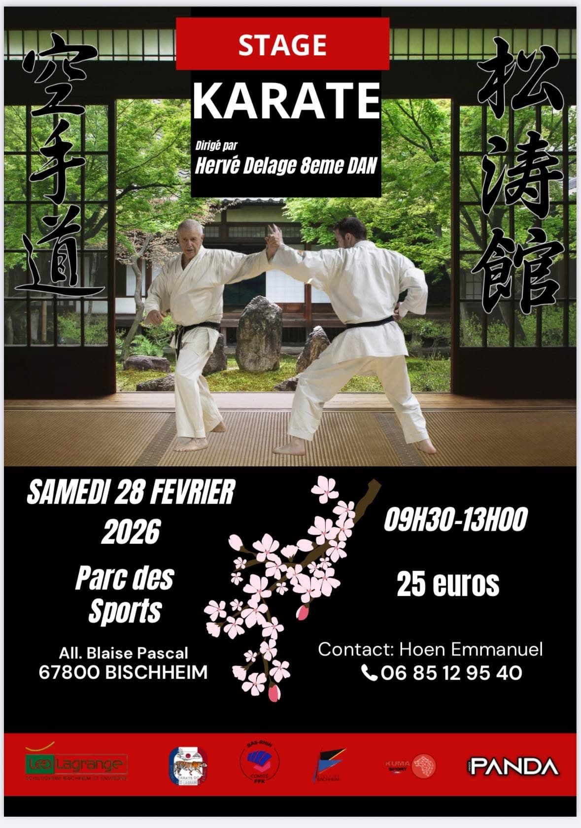 Stage Karate Do avec Hervé Delage 8e Dan – Bischheim le 28/02/2026 Date Sam. 28 Février 2026 de 09h30 à 13h Lieu Parc des Sports Allée Blaise pascal 67800 Bischheim