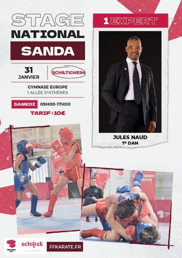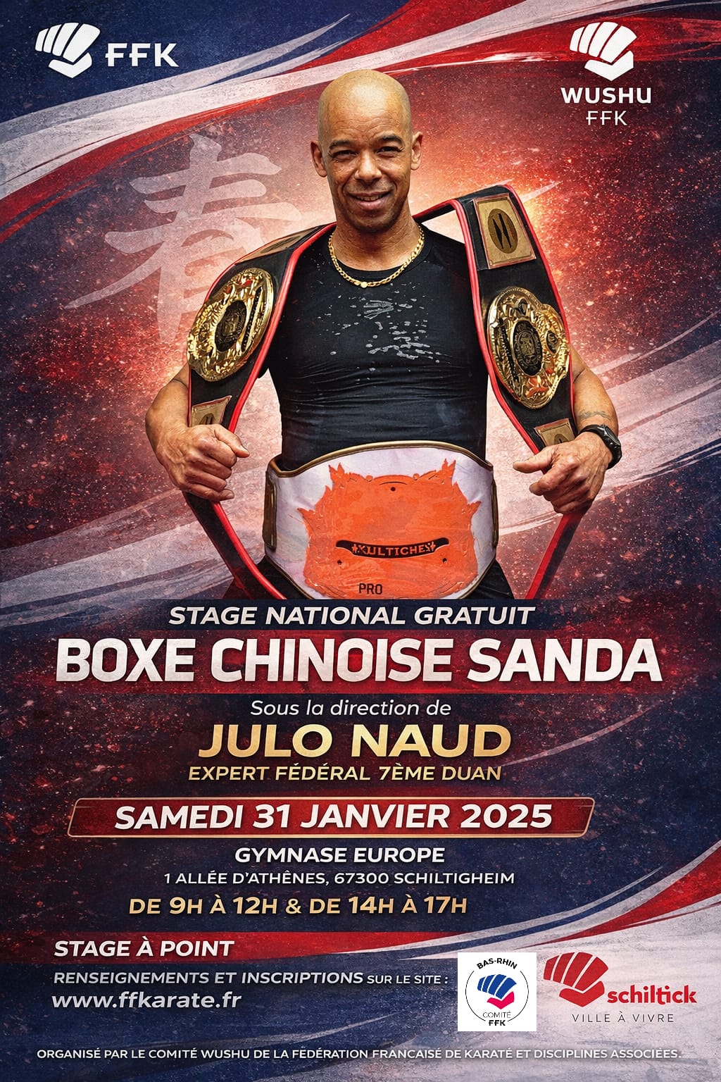 Stage National Boxe Chinoise Sanda avec Julo Naud, expert fédéral 7e Duan Date Sam. 31 Janvier 2026 de 09h à 17h Lieu 1 allée d’Athènes 67300 Schiltigheim
