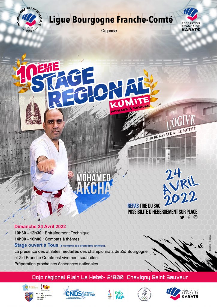 Dimanche 24 avril 2022 se tiendra le dernier stage régional kumité au Dojo Alain le Hetet, 21800 Chevigny Saint Sauveur.