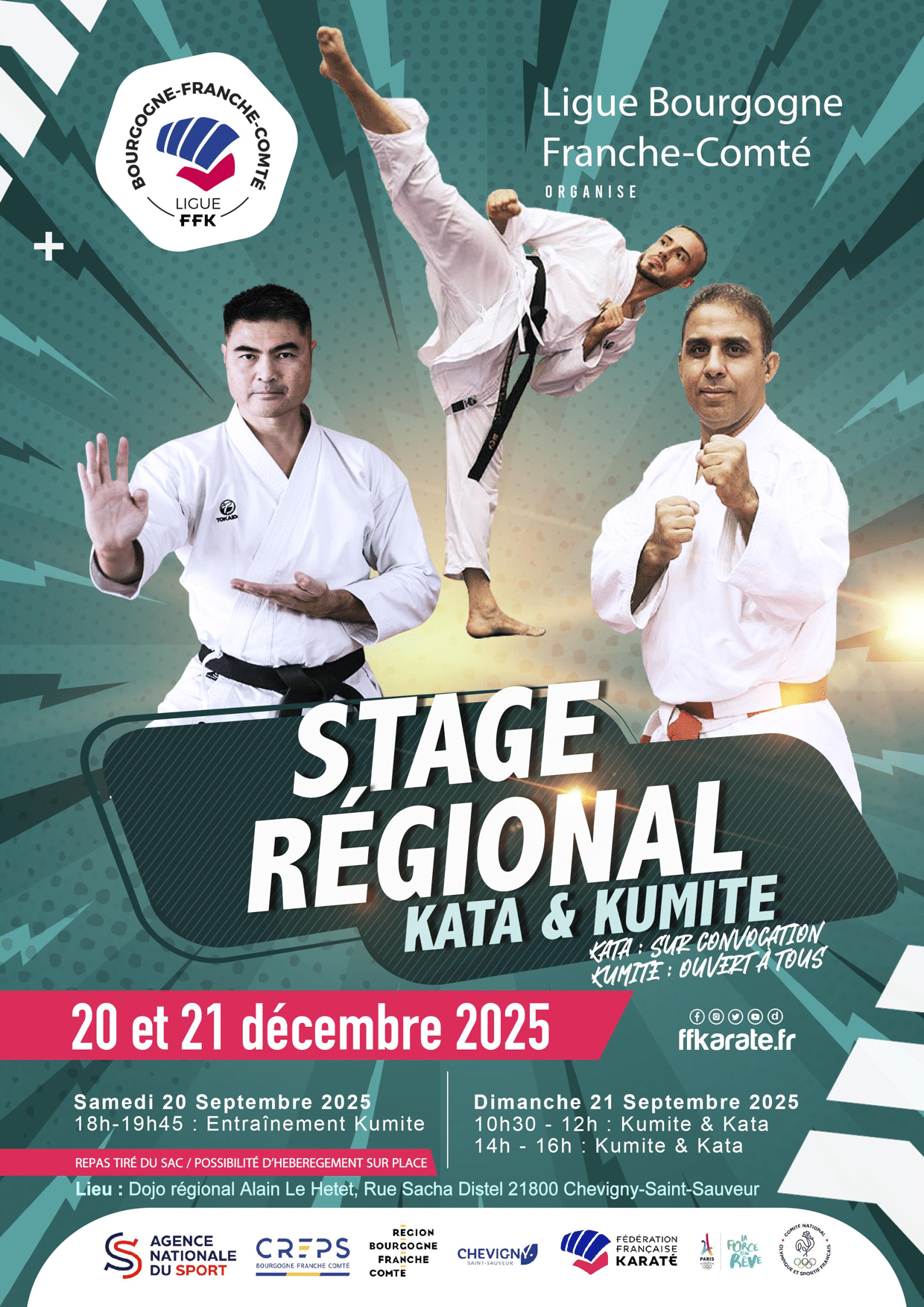 Stage Régional KUMITE / KATA (sur convocation) Date Du Sam. 20 au Dim. 21 Décembre 2025 Lieu Dojo Alain le Hetet rue Sacha Distel 21800 Chevigny Saint Sauveur Participation Kata sur convocation / Kumité ouvert à tous