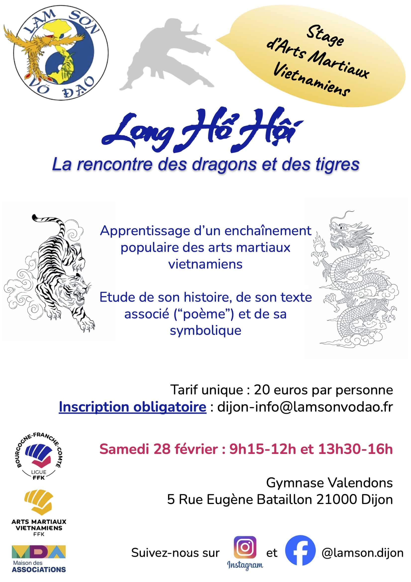 L’association Lam Son Vo Dao Dijon (arts martiaux vietnamiens) propose un stage d’apprentissage de l’enchaînement Long Hổ Hội (la rencontre des Dragons et des Tigres), ouvert à toutes personnes pratiquantes d’arts martiaux, le samedi 28 février 2026, au Gymnase des Valendons à Dijon.