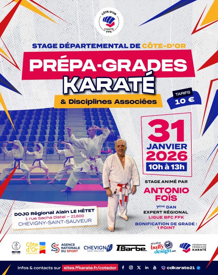 STAGE DÉPARTEMENTAL DE CÔTE-D’OR PRÉPA GRADES KARATE & Disciplines Associées (avec Antonio FOIS) Date Sam. 31 Janvier 2026 de 10h à 13h Lieu Dojo Alain le Hetet rue Sacha Distel 21800 Chevigny Saint Sauveur