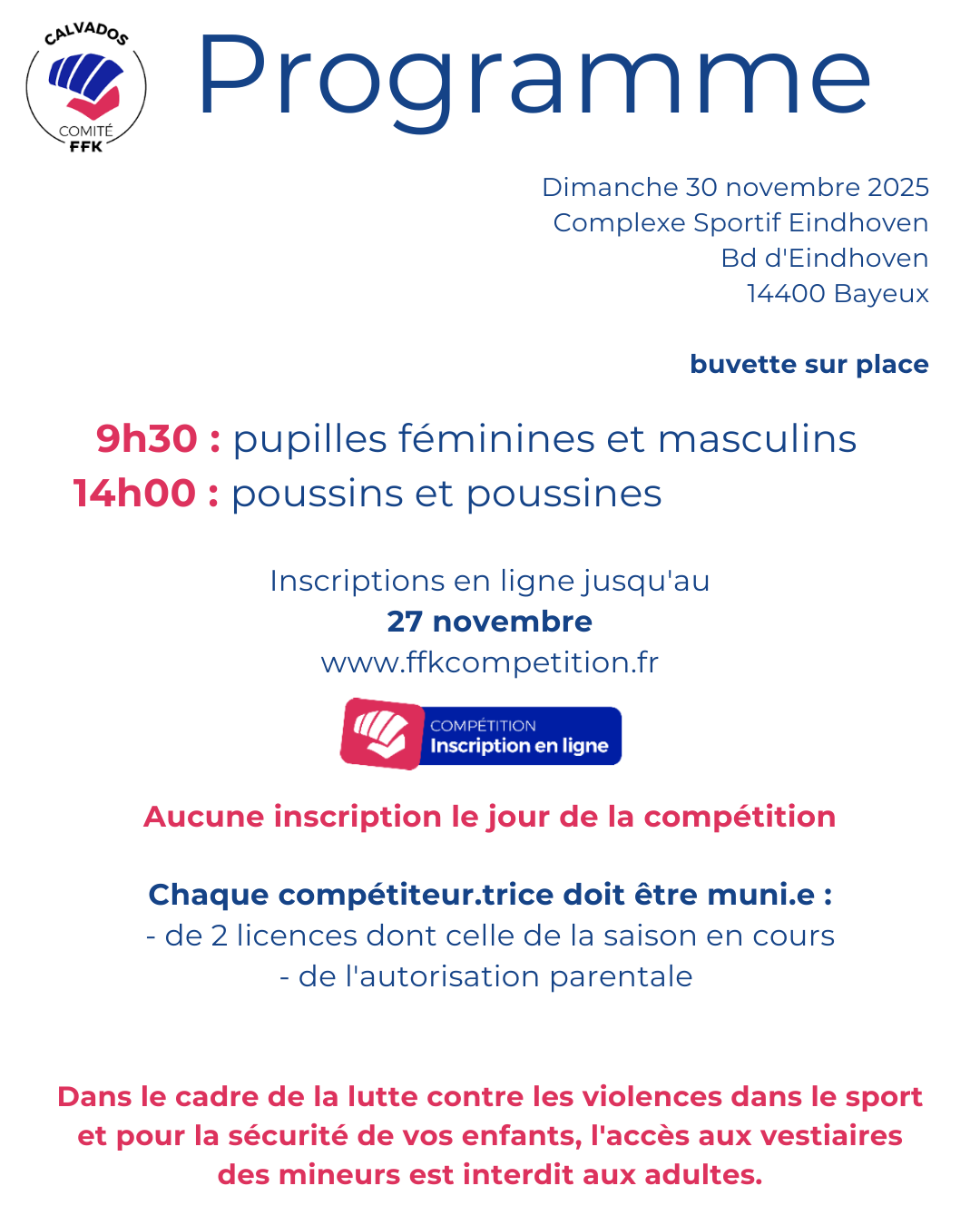 COUPE SELECTIVE PUPILLES/ POUSSINS KATA Date Dim. 30 Novembre 2025 Lieu complexe Eindhoven, BayeuxBOULEVARD D'EINDHOVEN 14400 BAYEUX