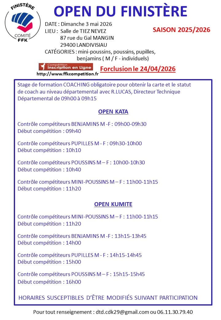 Open du Finistère Date Dim. 3 Mai 2026 de 08h à 18h Lieu Landivisiau (29) Forclusion le 24/04/2026 Salle Tiez Nevez 87 Rue Du General Mangin 29400 LANDIVISIAU