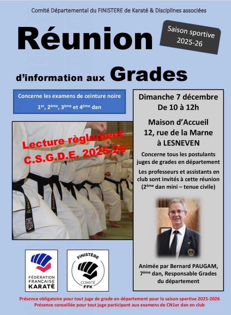 Réunion Grades KARATÉ Date Dim. 7 Décembre 2025 de 10h à 12h Lieu Lesneven (29) salle glycine (tout de suite à gauche en rentrant sur le parking)