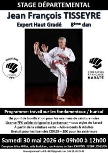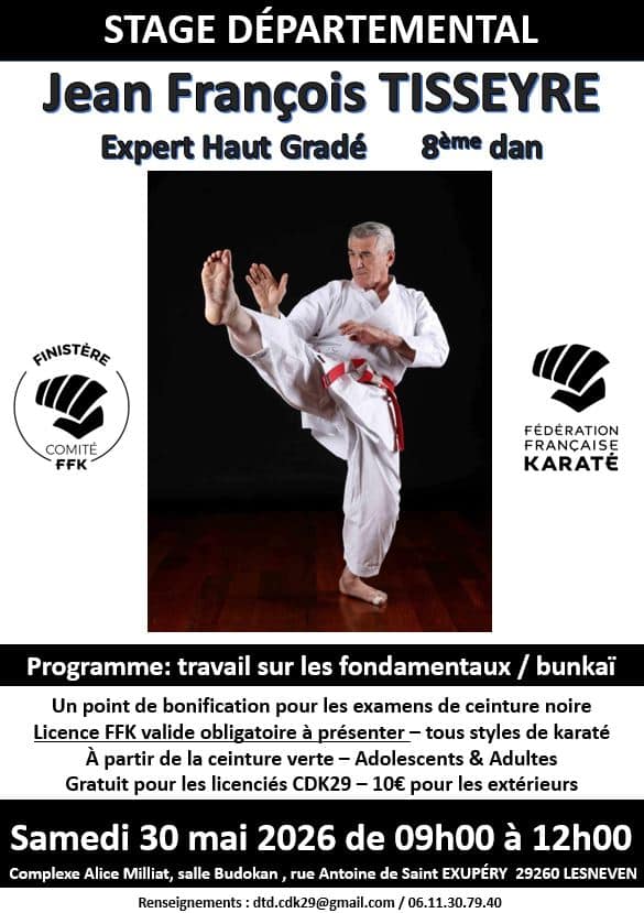 STAGE EXPERT HAUT GRADÉ Jean-François TISSEYRE 8ème dan Date Sam. 30 Mai 2026 de 09h à 12h Lieu Lesneven (29) Réservé licenciés FFK saison 2025-2026
