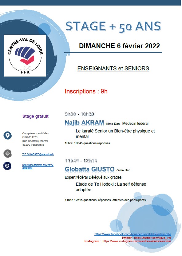 Najib Akram, 4e Dan, médecin fédéral, et Giobatta Giusto, 7e Dan, expert délégué aux grades, proposent un stage aux enseignants et aux seniors dimanche à venir, 6 février, à Vendôme, au complexe sportif des Grands Prés (rue Geoffroy Martel).