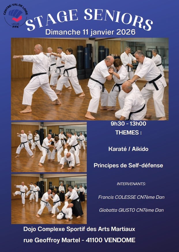 Gratuit, ce stage s’adresse surtout aux Seniors. Il sera dirigé par Francis Colesse, 7e Dan, et Giobatta Giusto, 7e Dan et se tiendra le dimanche 11 janvier (9h30-13h) au Complexe Sportif des Arts Martiaux, rue Geoffroy Martel, à Vendôme.