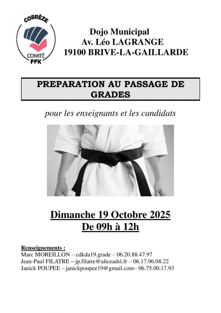 Stage préparation aux grades toutes disciplines Date Dim. 19 Octobre 2025 de 09h à 12h Lieu Dojo Municipal de Brive Avenue Léo Lagrange 19100 Brive