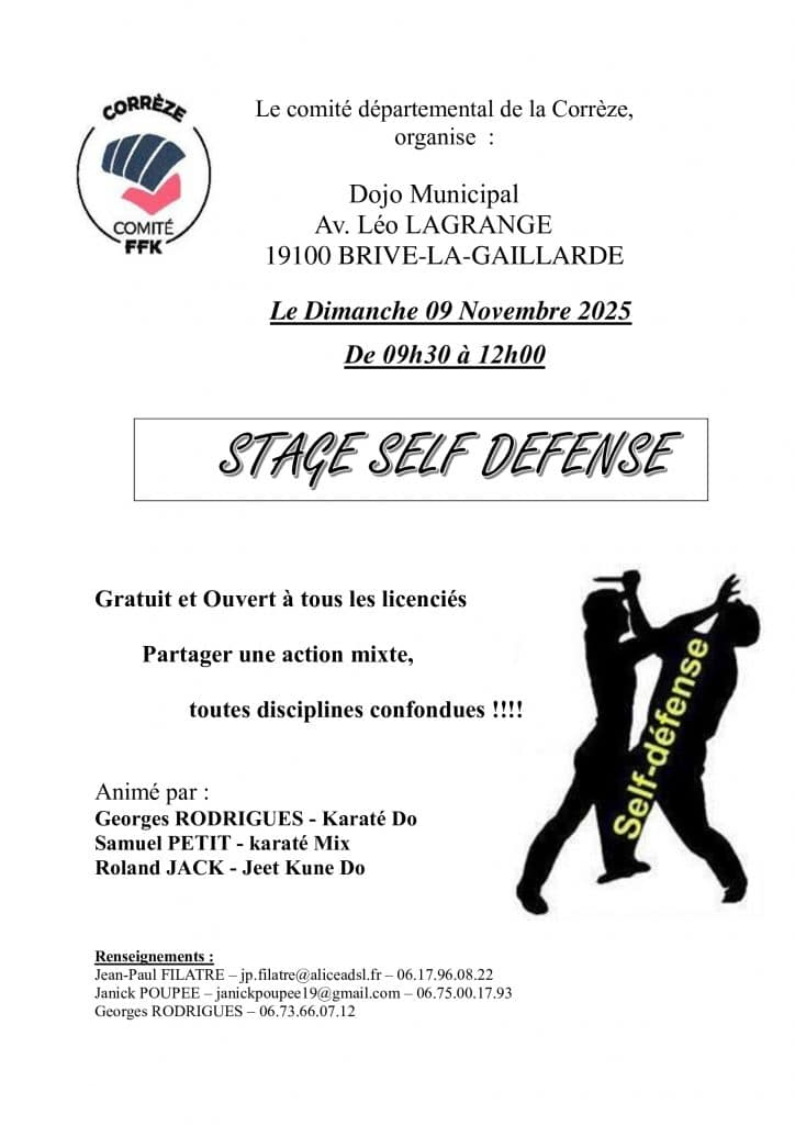 Stage Self-Défense multi-disciplines Date Dim. 9 Novembre 2025 de 09h30 à 12h Lieu Dojo Municipal de Brive Avenue Léo Lagrange 19100 Brive