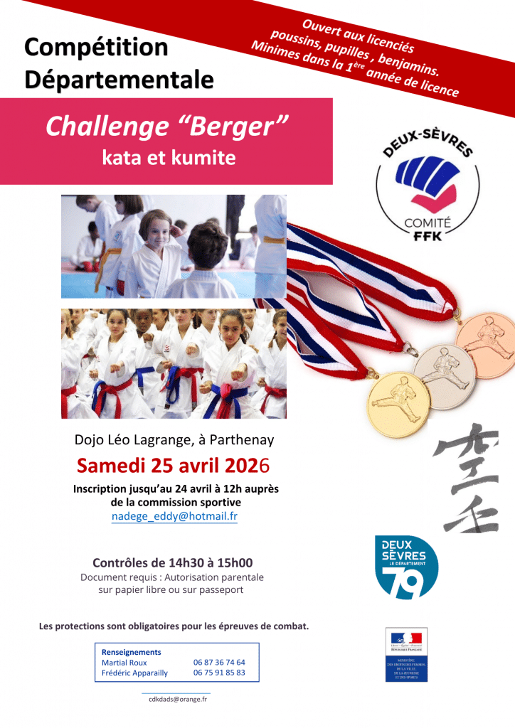 Le 18 avril 2026 au dojo de PARTHENAY (79), le CDKDA organise le traditionnel « Challenge Berger » réservé aux poussins, pupilles et benjamins dès la première année de licence ainsi qu’aux minimes débutants (1 année de licence maxi)