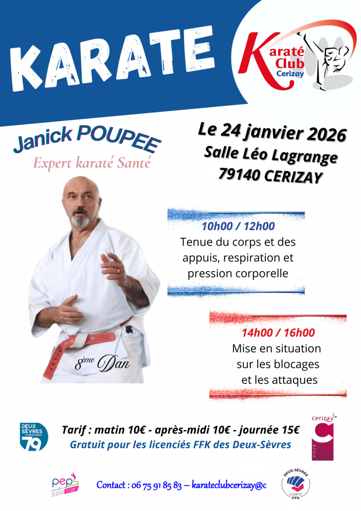 Stage Expert Y. POUPEE – Karaté Club Cerizay Date Sam. 24 Janvier 2026 de 10h à 17h Lieu Salle Léo Lagrange - 3, rue Alain Mimoun - 79140 CERIZAY