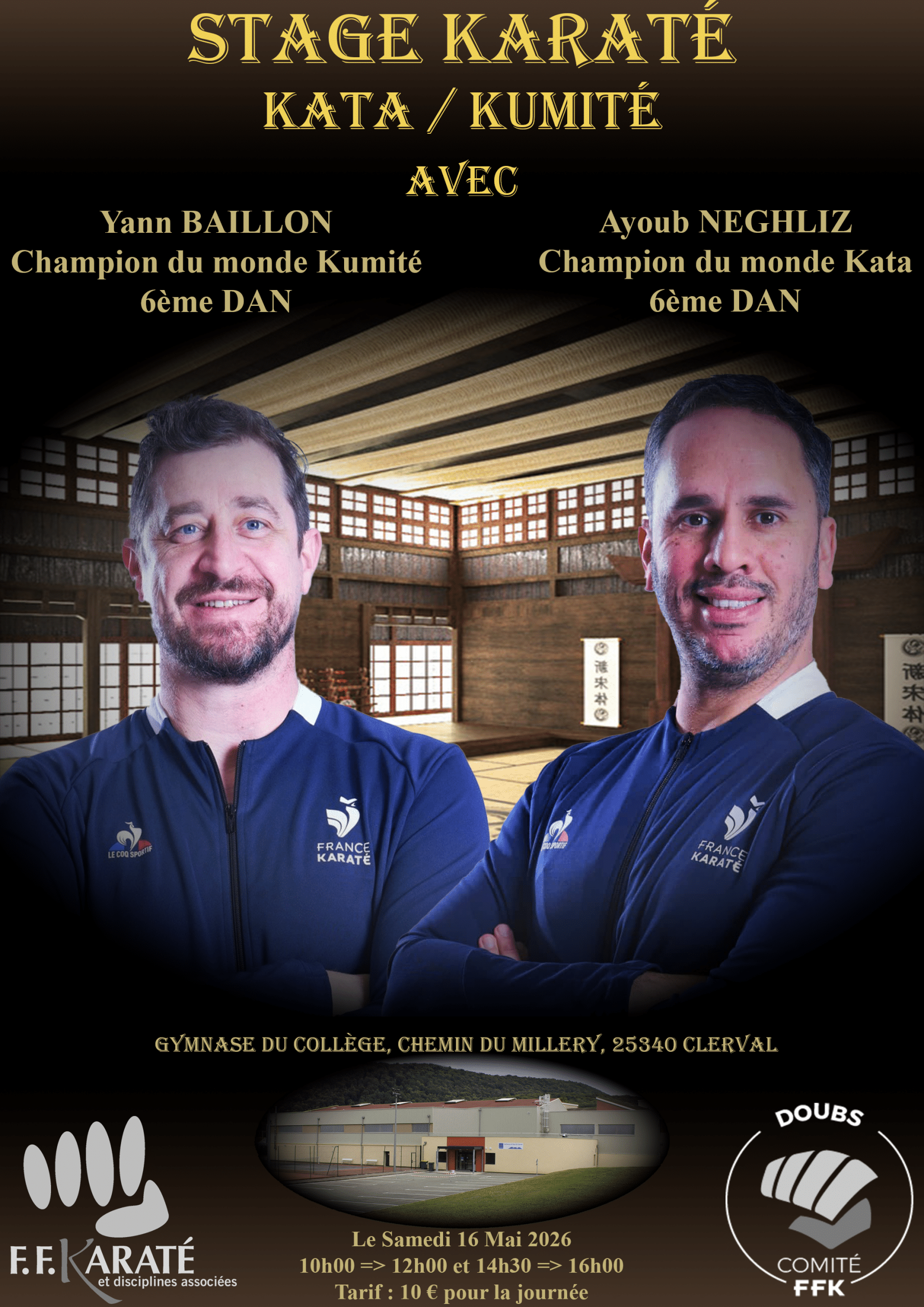 Stage Karaté (Kata / Kumité) avec Ayoub Neghliz et Yann Baillon Date Sam. 16 Mai 2026 de 10h à 16h Lieu Gymnase du collège - Chemin du Millery - 25340 Clerval