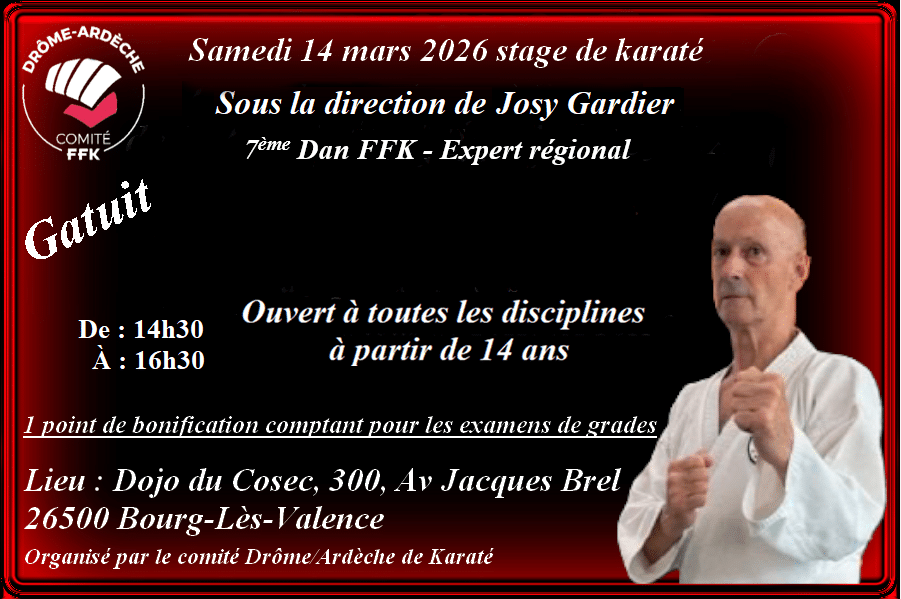 Pour la 5ème année, le comité organise un stage de Karaté départemental gratuit sous la direction de Josy Gardier 7ème Dan FFK expert régional.