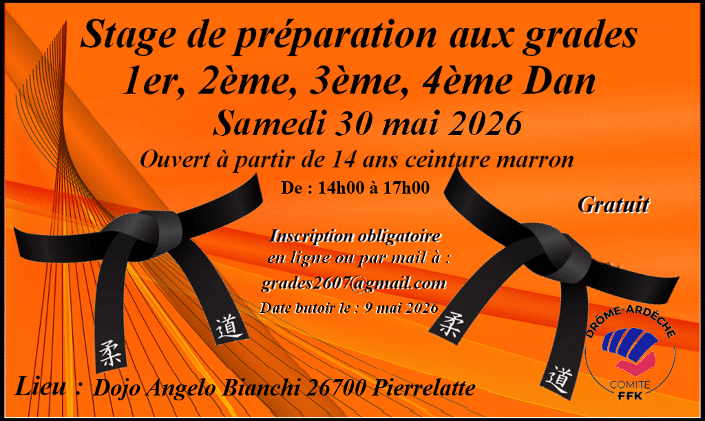 Stage de préparation aux grades 1er/2ème/3ème/4ème Dan. En vue d’obtenir une meilleure organisation, mais aussi de disposer d’intervenants dans les différentes disciplines, l’inscription est obligatoire. Une fiche d’inscription est à renseigner, avec la date du stage, le nom du club, la discipline et le grade en préparation. Elle est aussi à votre disposition sur le site du comité (rubrique, documents utiles),