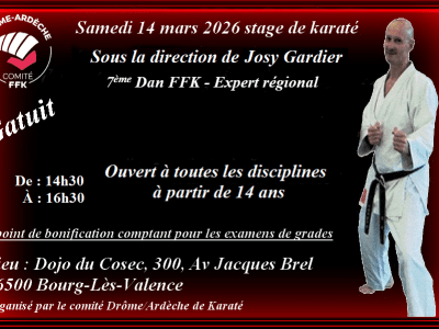 Sous la direction de : Christian CLAUSE 9ème Dan karaté Expert fédéral Miguel Xavier 5ème Dan FFK De 09h00 à 12h00 Ouvert à toutes les disciplines À partir de 14 ans 1 point de bonification comptant pour les examens de grades Participation 15€ Lieu : Gymnase Alain Zammit 12 Rue du Pont du Gat 26000 [...]