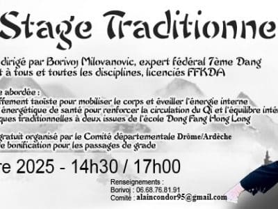 Il aura lieu le 6 décembre 2025 au gymnase Berthelot 17, rue Marcellin Berthelot 26000 Valence de 14h30 à 17h00. Au programme : l’échauffement taoïste, le travail énergétique de santé, ainsi que des techniques traditionnelles à deux issues de la voie Dong Fang Hong Long.