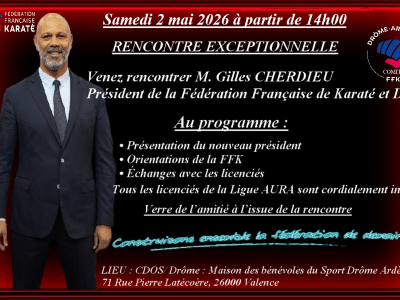 Samedi 2 mai 2026 : À partir de 14h00 Le Comité Drôme/Ardèche a le plaisir d’accueillir M. Gilles Cherdieu, Président de la Fédération Française de Karaté et Disciplines Associées, à l’occasion d’une rencontre ouverte à tous les licenciés. Ce rendez-vous sera l’occasion pour le Président de se présenter, de partager les grandes orientations de la [...]