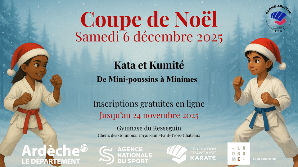 Samedi 6 décembre 2025 Inscription en ligne gratuite. Date butoir au plus tard le mardi 24 novembre 2025, dernier délai. Lieu : Gymnase de Resseguin chemin des Goumoux 26130 St Paul Trois Châteaux