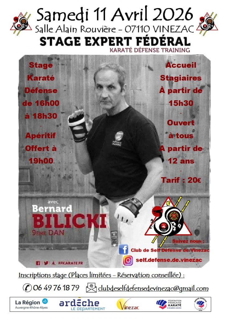 Le Club de Self-Défense de Vinezac est fier de vous proposer son prochain stage en Karaté-Défense-Training sous la direction de Bernard BILICKI Senseï (9eme Dan FFK et Expert Fédéral), qui nous fait l’honneur de venir au Club pour la 5eme année consécutive