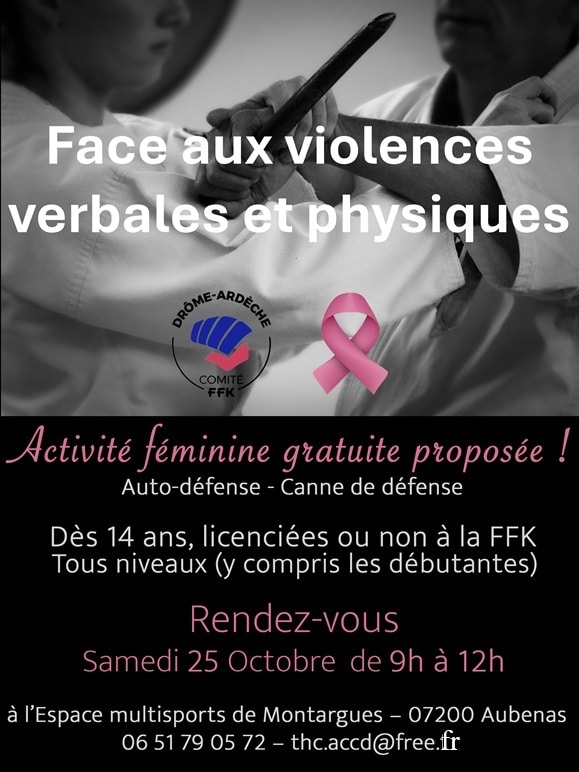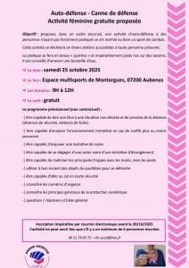 Le club E S C A M A R (Art du Combat et Canne de Défense) organise le samedi 25/10/2025 une activité féminine gratuite auto-défense / canne de défense.