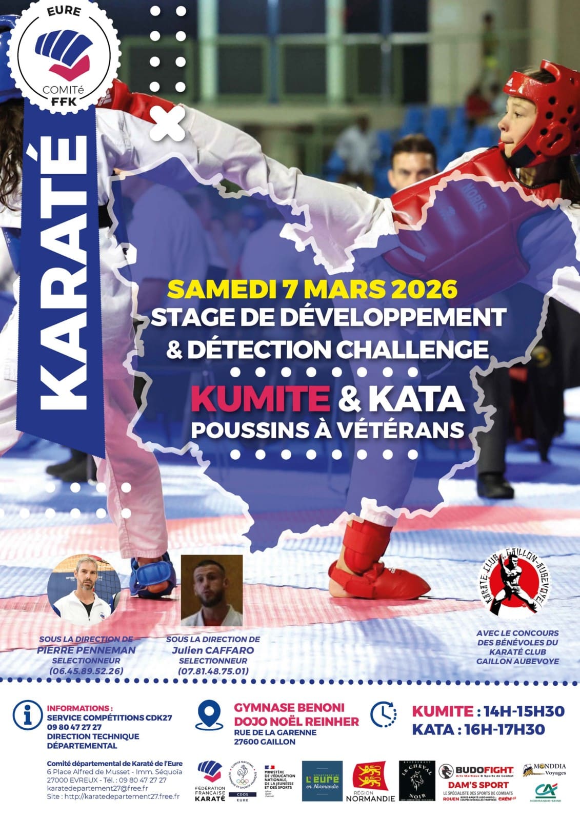 Stage Développement & Sélection Equipe de L’EURE KARATÉ Date Sam. 7 Mars 2026 de 14h à 17h Lieu DOJO Noël REIHNER - Gymnase BENONI - GAILLON (27)RUE DE LA GARENNE 27600 GAILLON