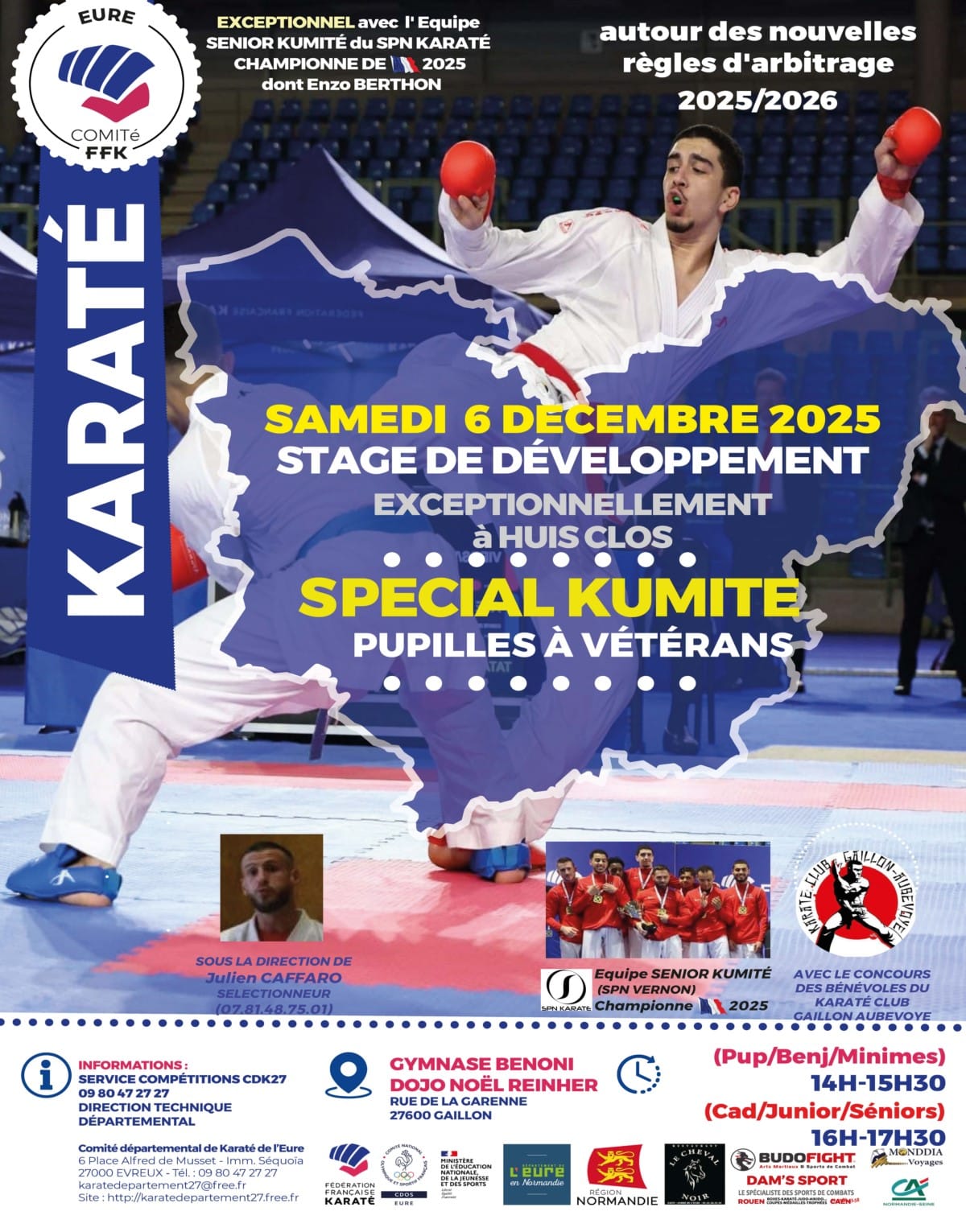 Stage Développement & Sélection Equipe de L’EURE KARATÉ – SPECIAL COMBAT Date Sam. 6 Décembre 2025 de 14h à 17h Lieu DOJO Noël REIHNER - Gymnase BENONI - GAILLON (27)RUE DE LA GARENNE 27600 GAILLON