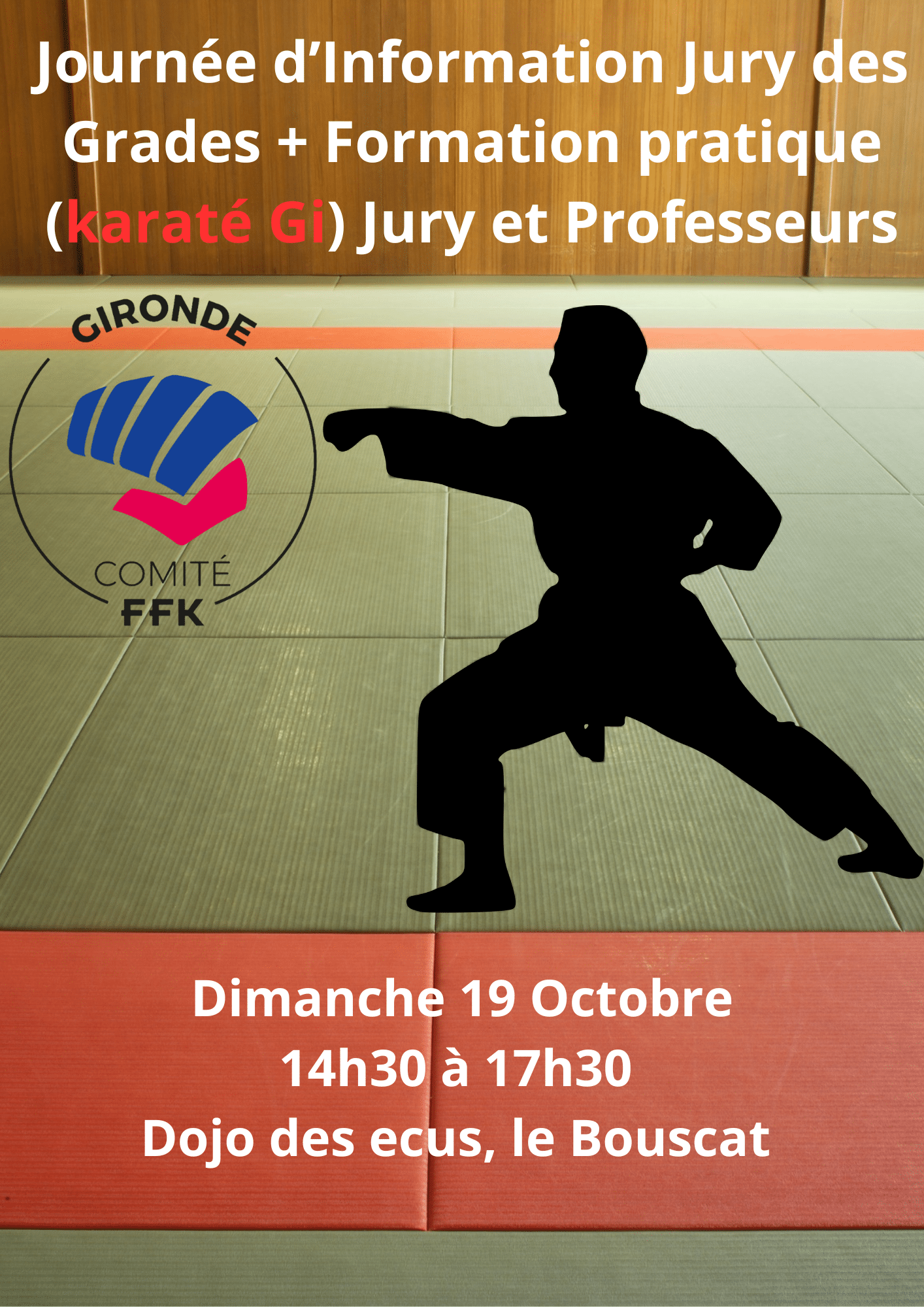Journée d’Information Jury des Grades + Formation pratique (karaté Gi) Jury et Professeurs Date Dim. 19 Octobre 2025 de 14h30 à 17h30 Lieu Dojo des Ecus - LE BOUSCAT (33)