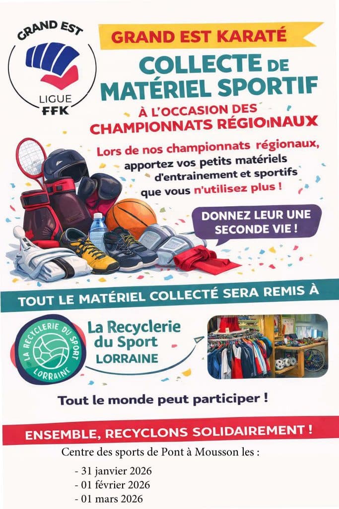 Dans une démarche éco-responsable et solidaire, la Ligue Grand Est de Karaté et disciplines associées organise une collecte de petits matériels et équipements sportifs à l’occasion de ses championnats régionaux.