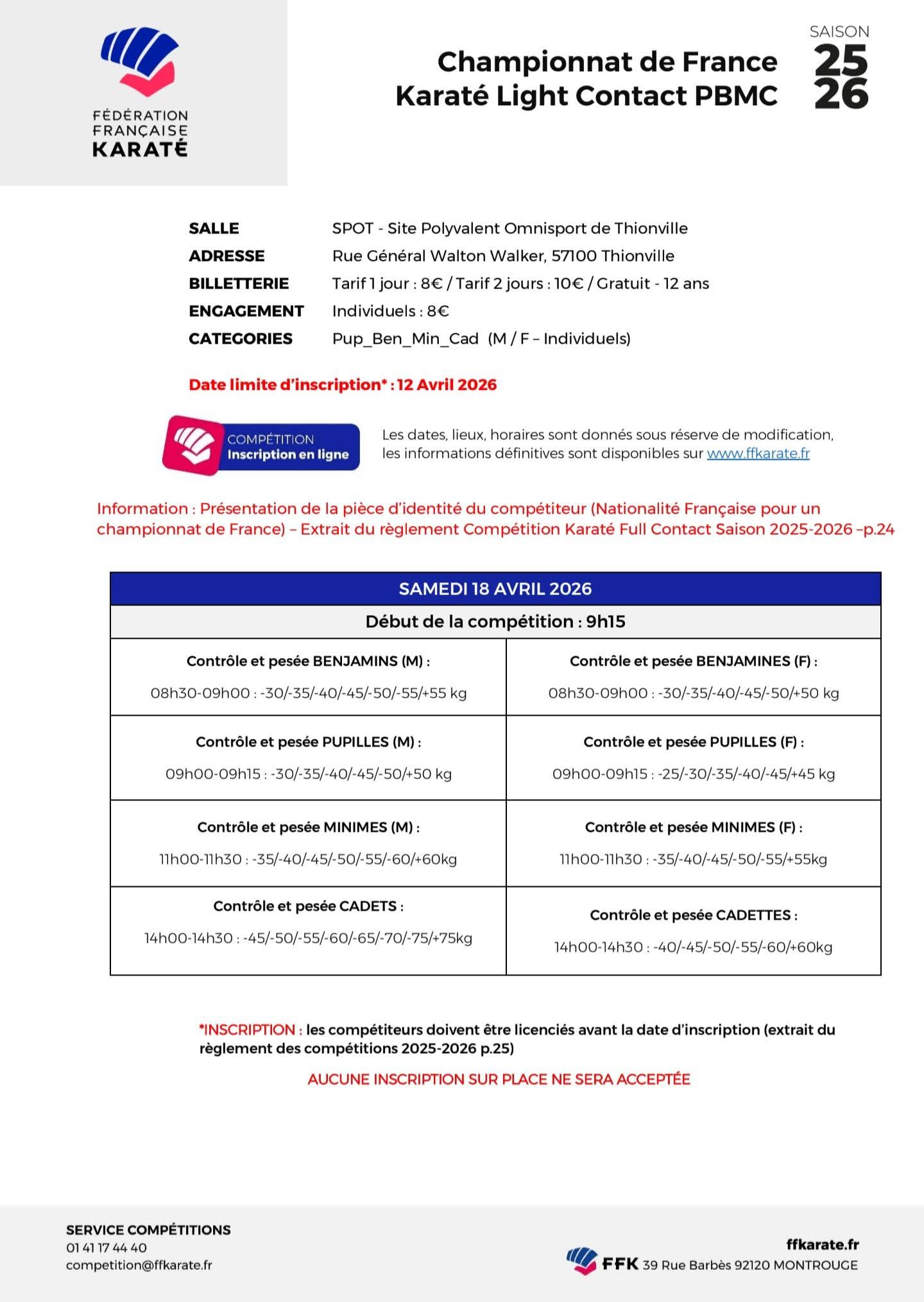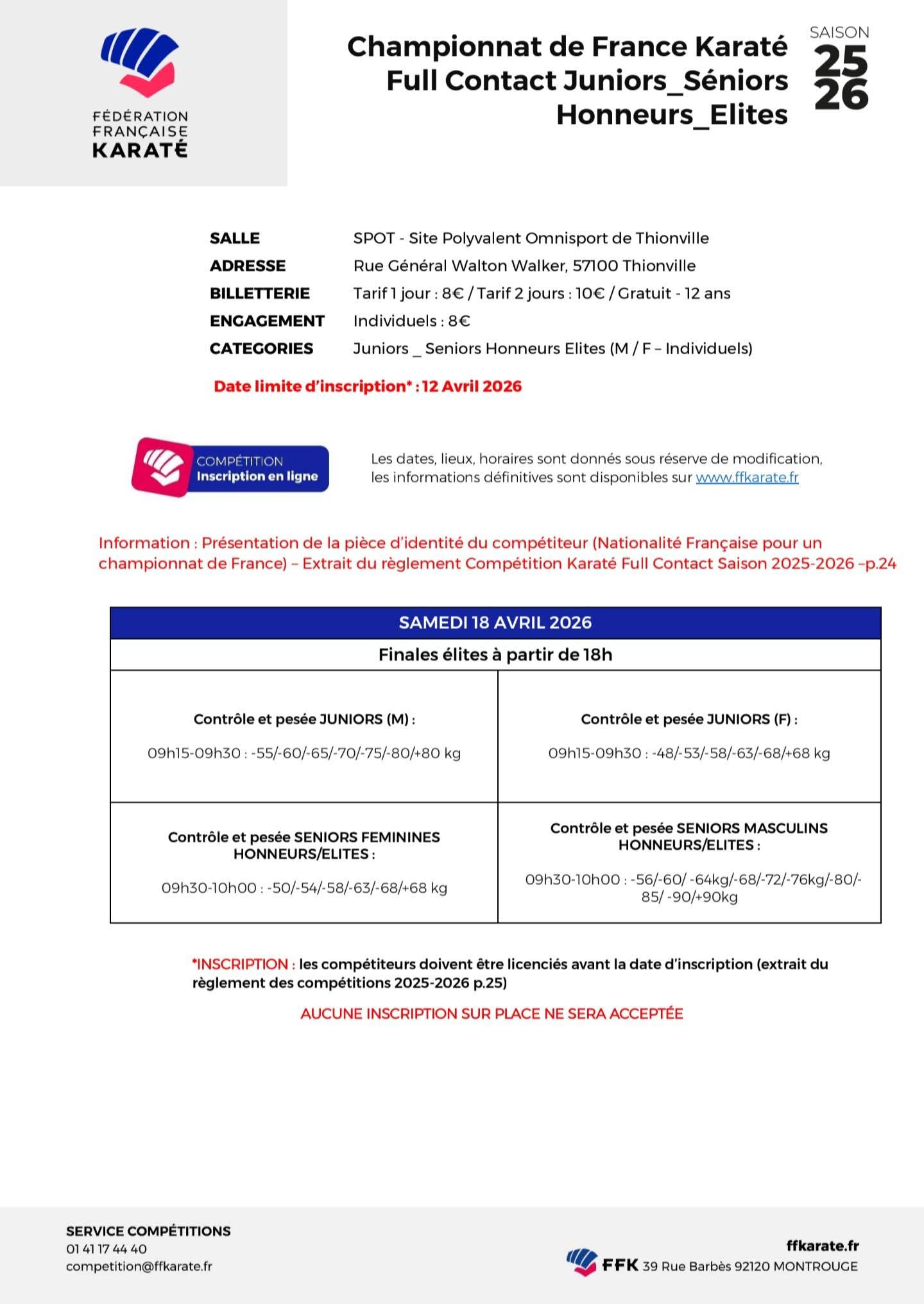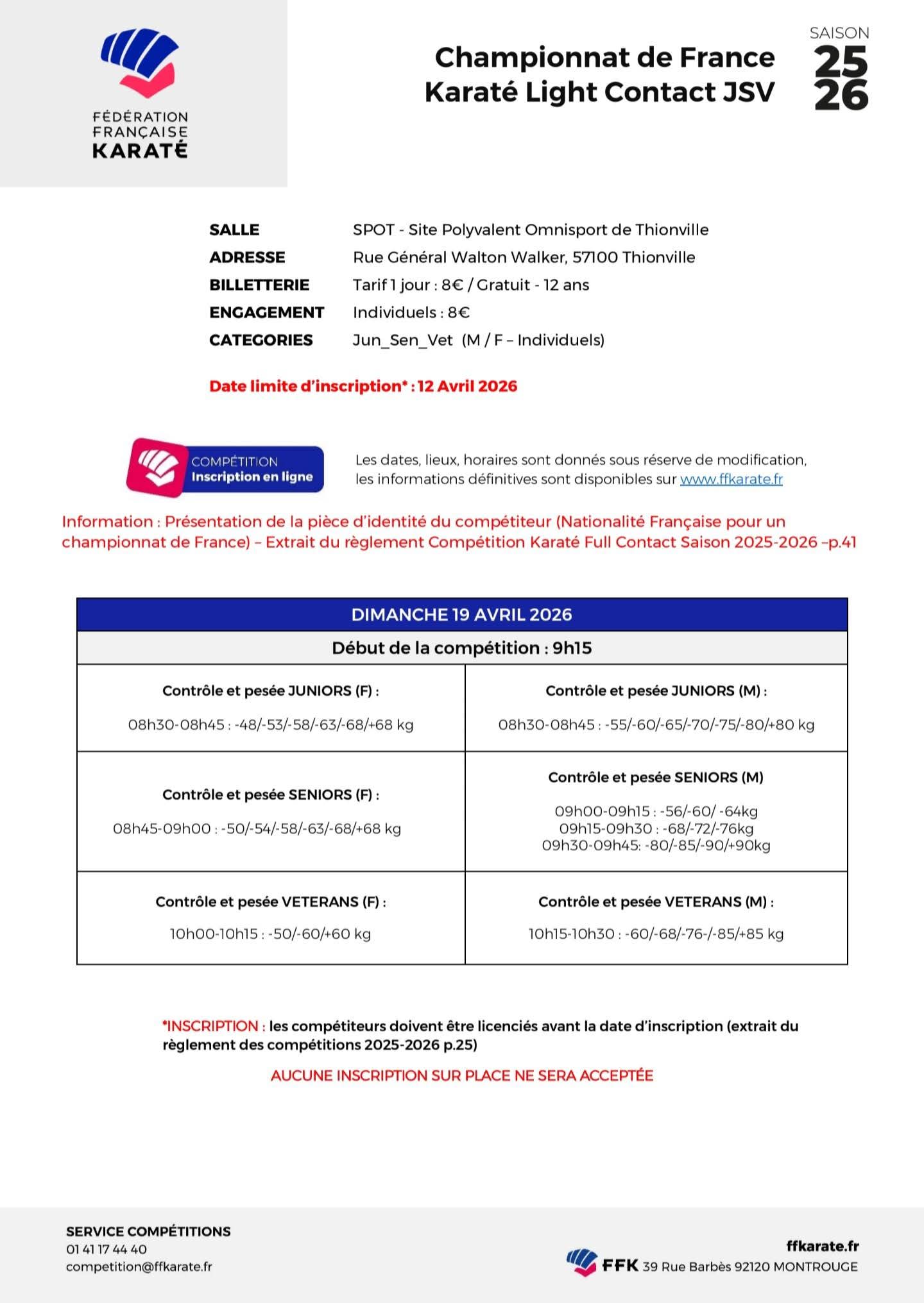 Championnat de France Karaté Light Contact et Full Contact Date Du Sam. 18 au Dim. 19 Avril 2026 Lieu Thionville 57
