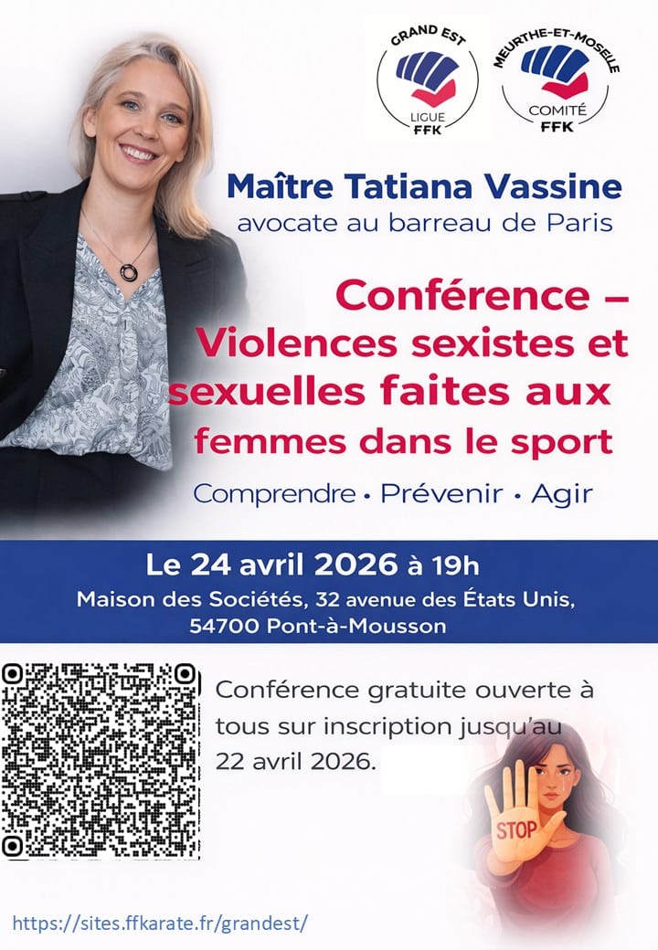 Conférence sur les violences faites aux femmes avec Maitre Tatiana VASSINE Date Ven. 24 Avril 2026 de 19h à 20h30 Lieu Pont à Mousson- maison des sociétés- avenue-des-Etats-Unis