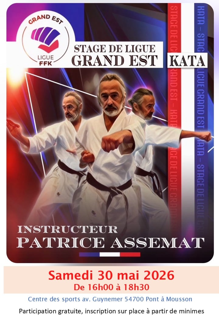 Entrainement régional Kata Date Sam. 30 Mai 2026 de 16h à 18h30 Lieu Pont à Mousson- centre des sports - av Guynemer 54700Centre des Sports Bernard Guy