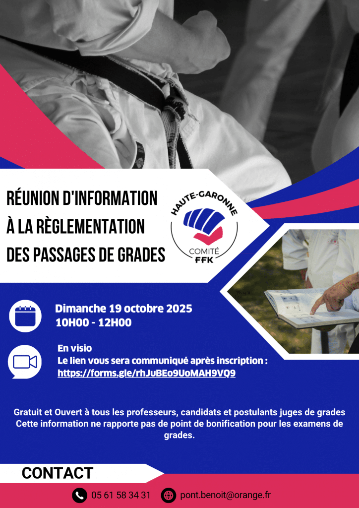 Pour faciliter la participation de tous, la réunion d’information sur la réglementation des passages de grades se tiendra désormais en visio.