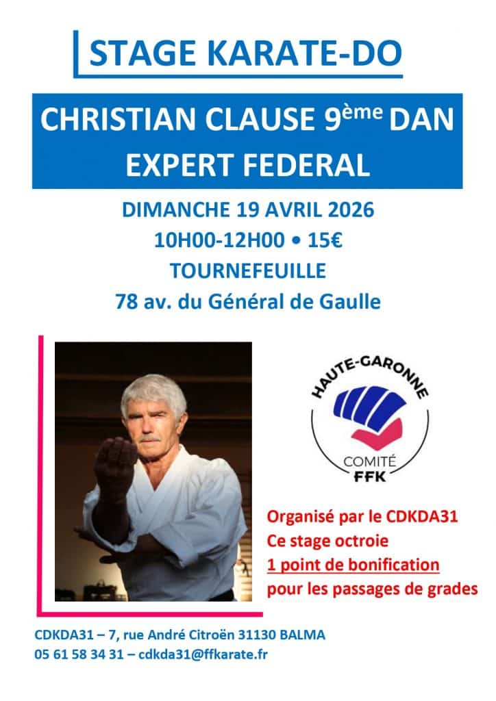 Le Comité Départemental de Karaté et Disciplines Associées de la Haute-Garonne (CDKDA31) organise un stage de karaté-dō le dimanche 19 avril 2026 à Tournefeuille, sous la direction de Christian Clause, 9ᵉ Dan, Expert fédéral.