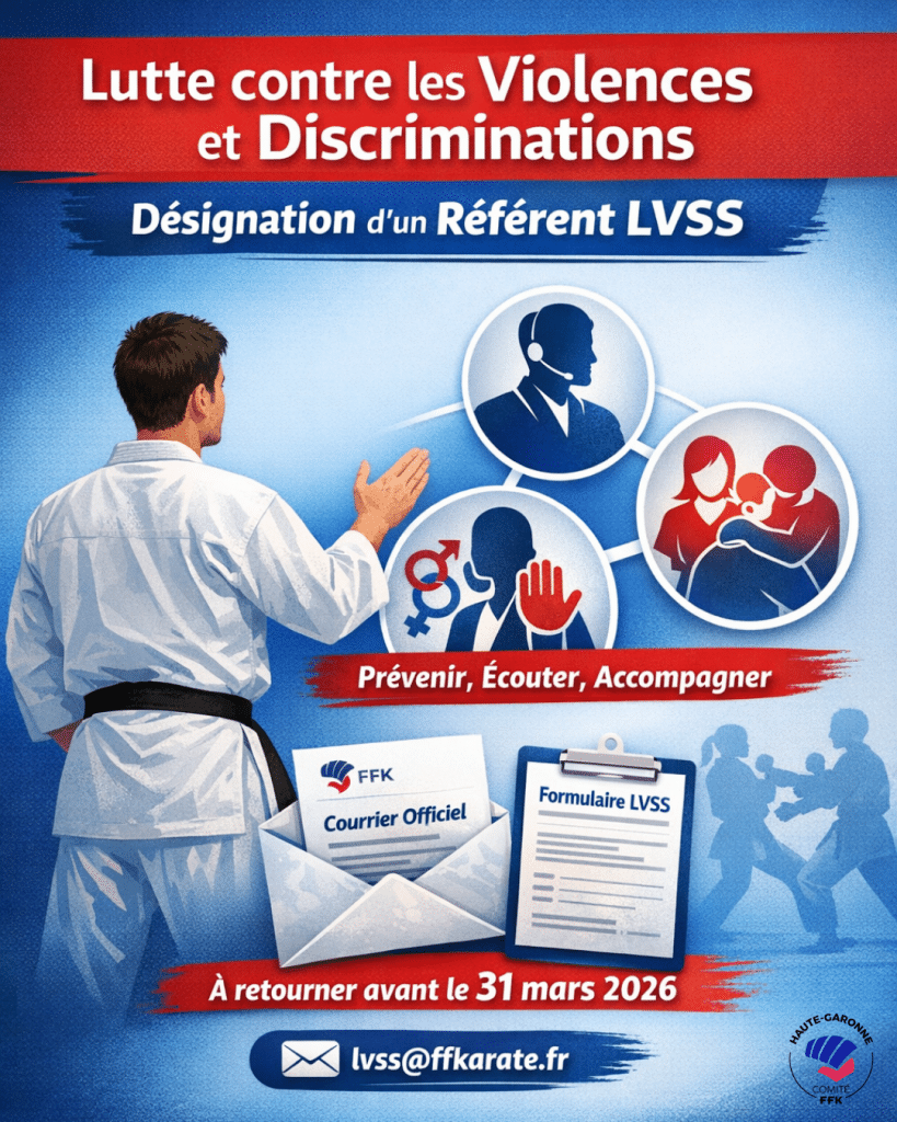 Dans le cadre du renforcement du dispositif fédéral de prévention et de lutte contre les violences sexistes et sexuelles, le harcèlement et les discriminations, la Fédération Française de Karaté et Disciplines Associées met en place un réseau de référents LVSS au sein des Ligues et Comités départementaux.