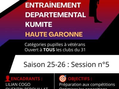 Chers responsables et enseignants, Le Comité Départemental de Karaté de la Haute-Garonne a le plaisir de vous inviter à la 5e session d’entraînement départemental Kumité, ouverte à tous les clubs du 31, des catégories pupilles à vétérans.