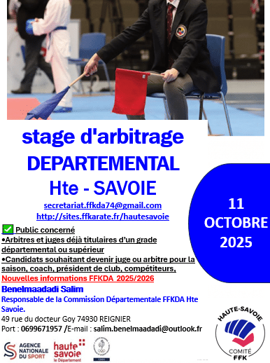 Date : samedi 11 octobre 2025. Horaires : 9h00 à 15h00. Lieu : À la MJC 74 930 Reignier. 📘 Programme prévisionnel Accueil et ouverture du stage. Rappel des objectifs de la saison et des attendus de l’arbitrage départemental. Présentation et mise à jour du règlement FFK 2025-2026. Pause déjeuner. Étude des cas [...]