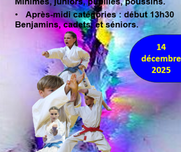 Événement Compétition de karaté organisée par le Comité Départemental Karaté 74. Date : Samedi 20 décembre 2025. Lieu : Gymnase de Reignier, à 14h00. Entrée gratuite pour tous les participants et spectateurs.